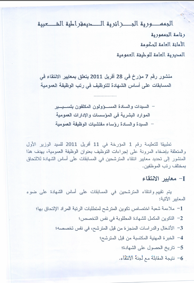 المنشور رقم 7 المؤرخ في 28 أفريل 2011 المتعلق بمعايير الانتقاء في المسابقات على أساس الشهادة للتوظيف في رتب الوظيفة العمومية