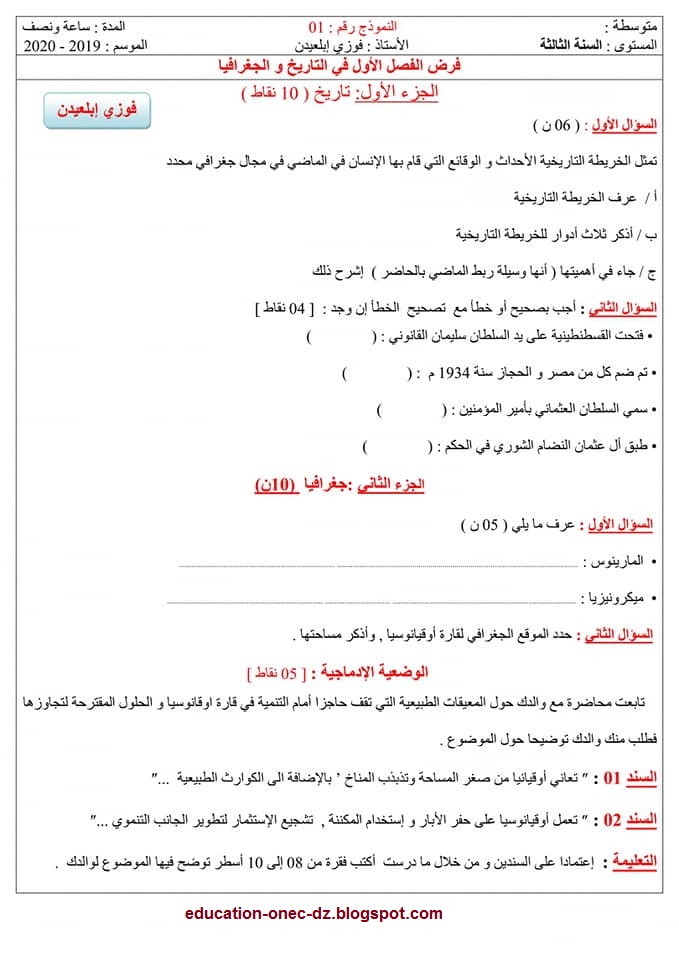 فرض التاريخ والجغرافيا الفصل الأول للسنة الثالثة متوسط الجيل الثاني نموذج 7 موقع التعليم الجزائري Dzetude