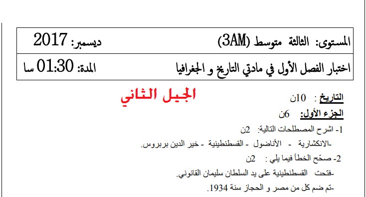 اختبار الفصل الثاني في التاريخ والجغرافيا للسنة الثالثة متوسط 2017