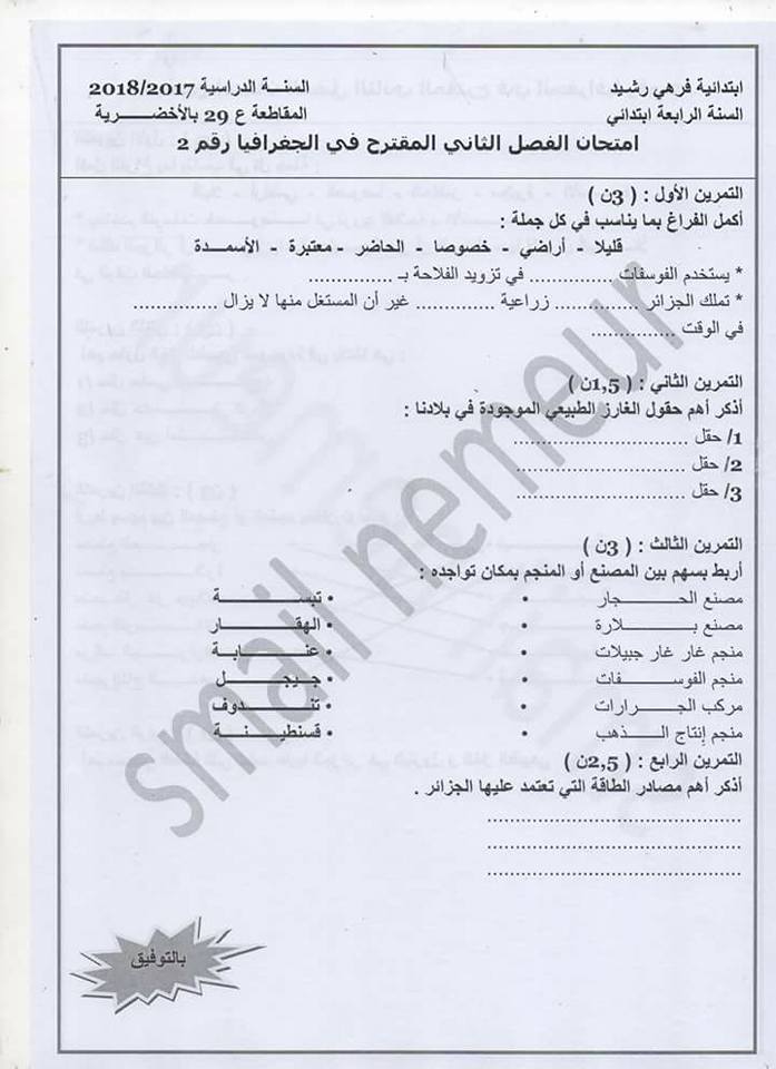 اختبارات في التاريخ والجغرافيا للسنة الرابعة ابتدائي الفصل الثاني الجيل الثاني 2017 2018 مع الحل