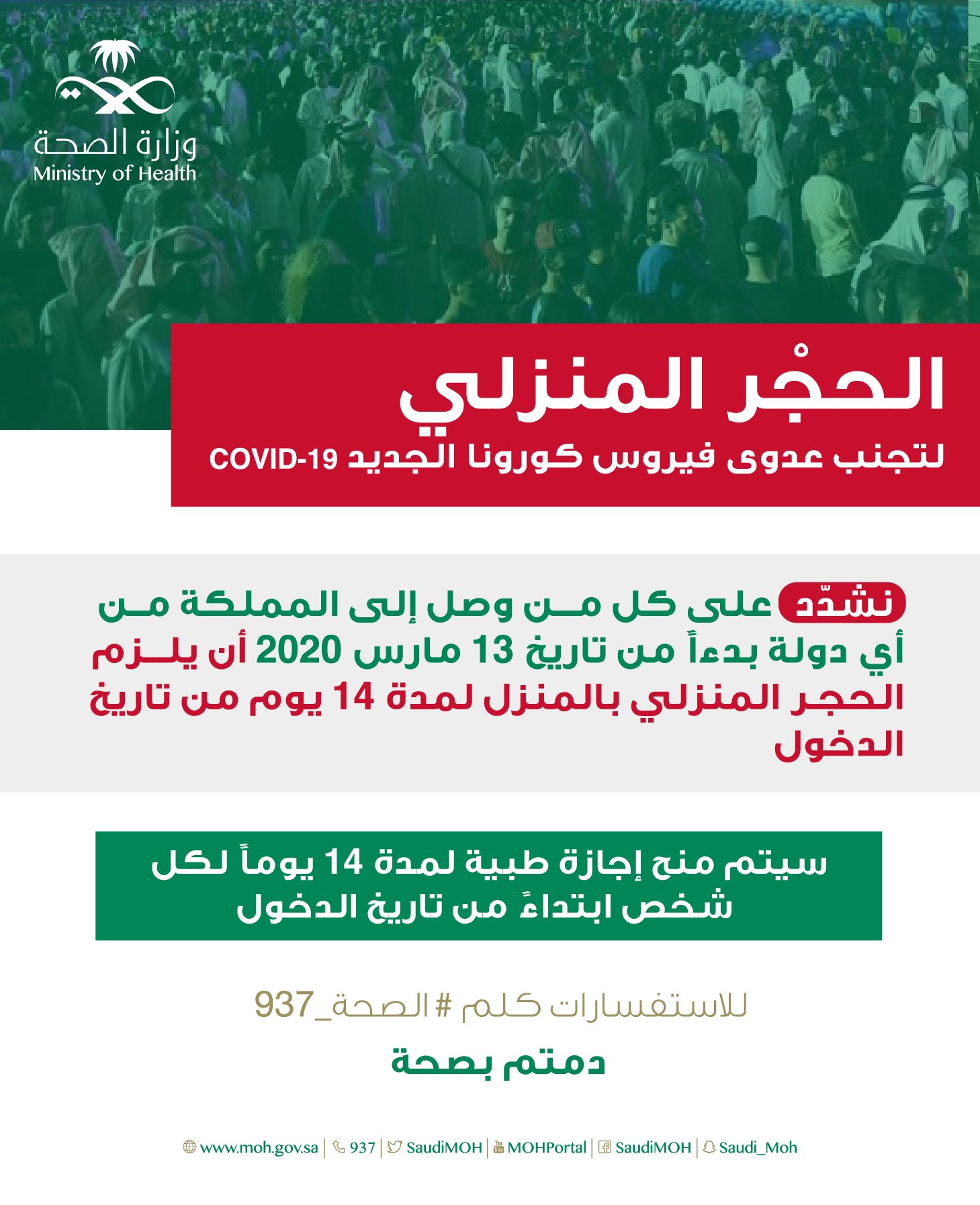 و ز ا ر ة ا لـ صـ حـ ة السعودية On Twitter هام جدا نشدد على جميع القادمين من خارج المملكة الالتزام بالحجر المنزلي لمدة ١٤ يوما من تاريخ الدخول الإجازة
