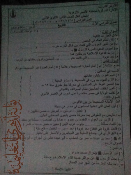 اختبارات تاريخ واجاباتها للصف الثاني عشر ادبي الفصل الثاني