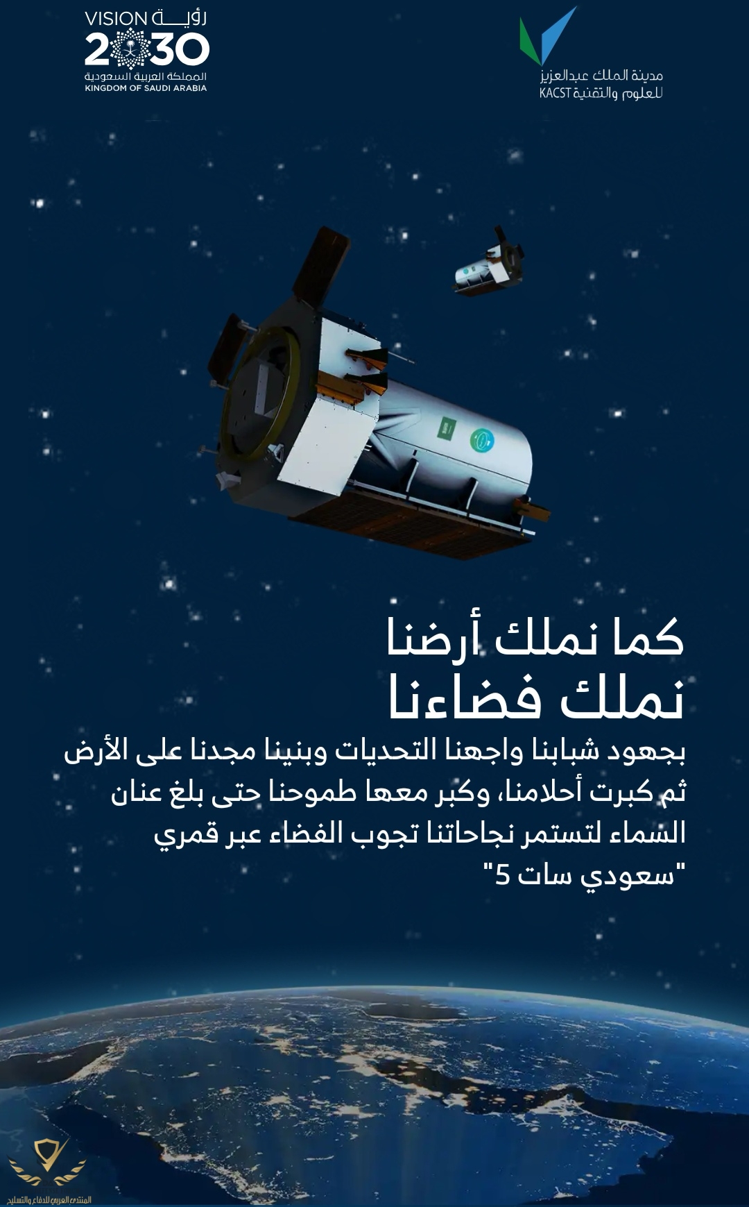 مدينة الملك عبدالعزيز للعلوم والتقنية در توییتر بدأت رحلة المملكة في مجال الأقمار عام 2000م بإطلاق أول قمر سعودي واستمرت الإنجازات لتحلق عاليا في الفضاء بإطلاق خمسة عشر قمرا صناعيا لنا الأرض والفضاء