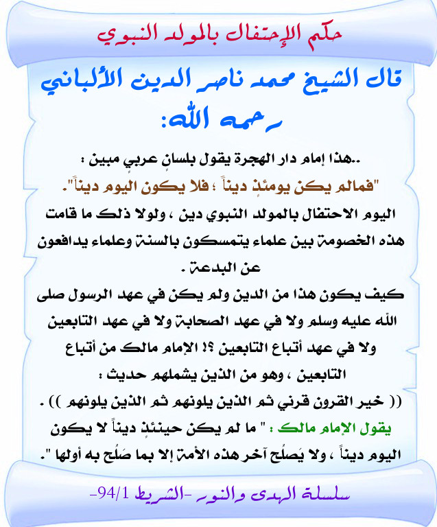 حكم الإحتفال بالمولد النبوي ابن باز ابن عثيمين الألباني بطاقات دعوية منتديات الإمام الآجري