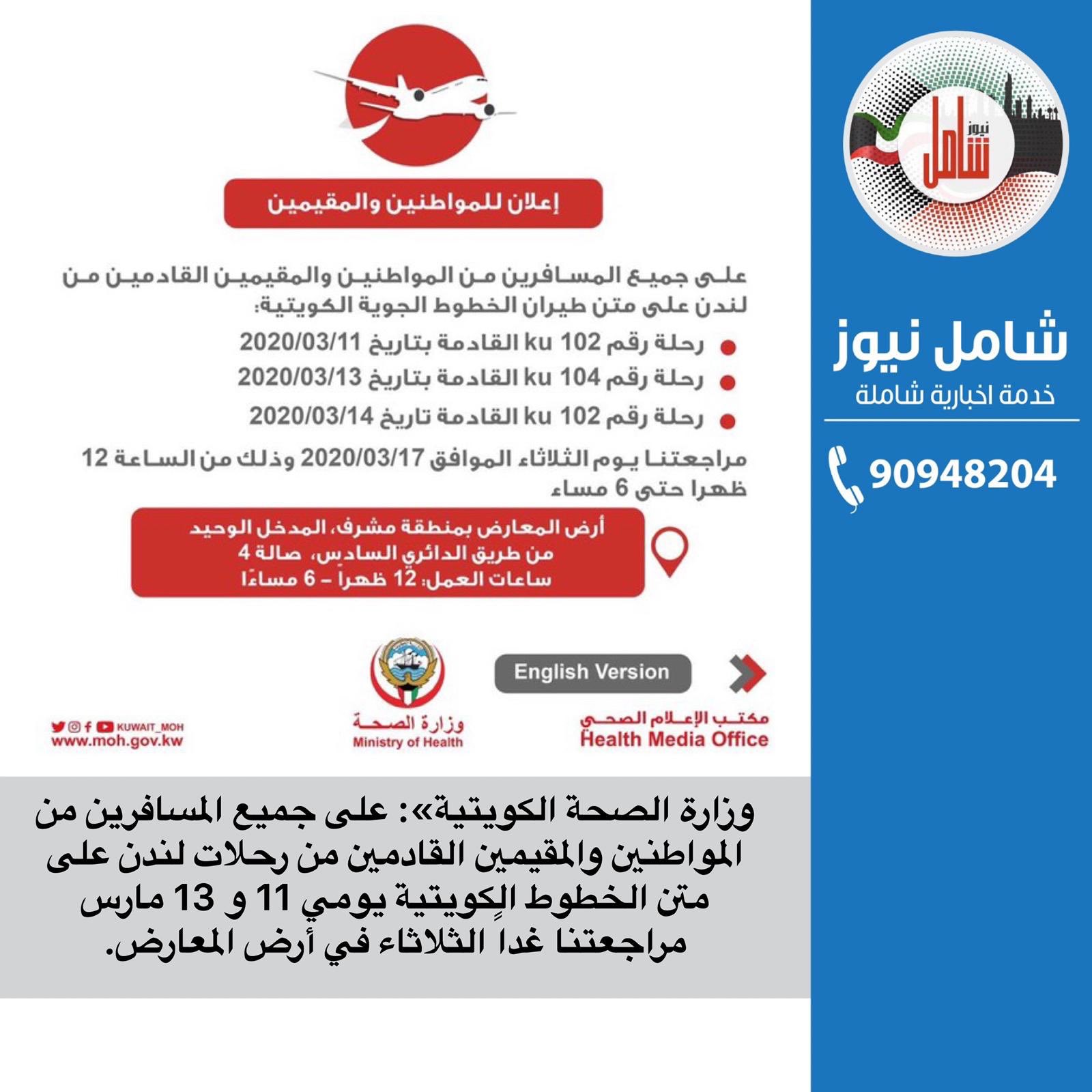 شامل نيوز على تويتر وزارة الصحة الكويتية على جميع المسافرين من المواطنين والمقيمين القادمين من رحلات لندن على متن الخطوط الكويتية يومي 11 و 13 مارس مراجعتنا Https T Co 3jastuntzg