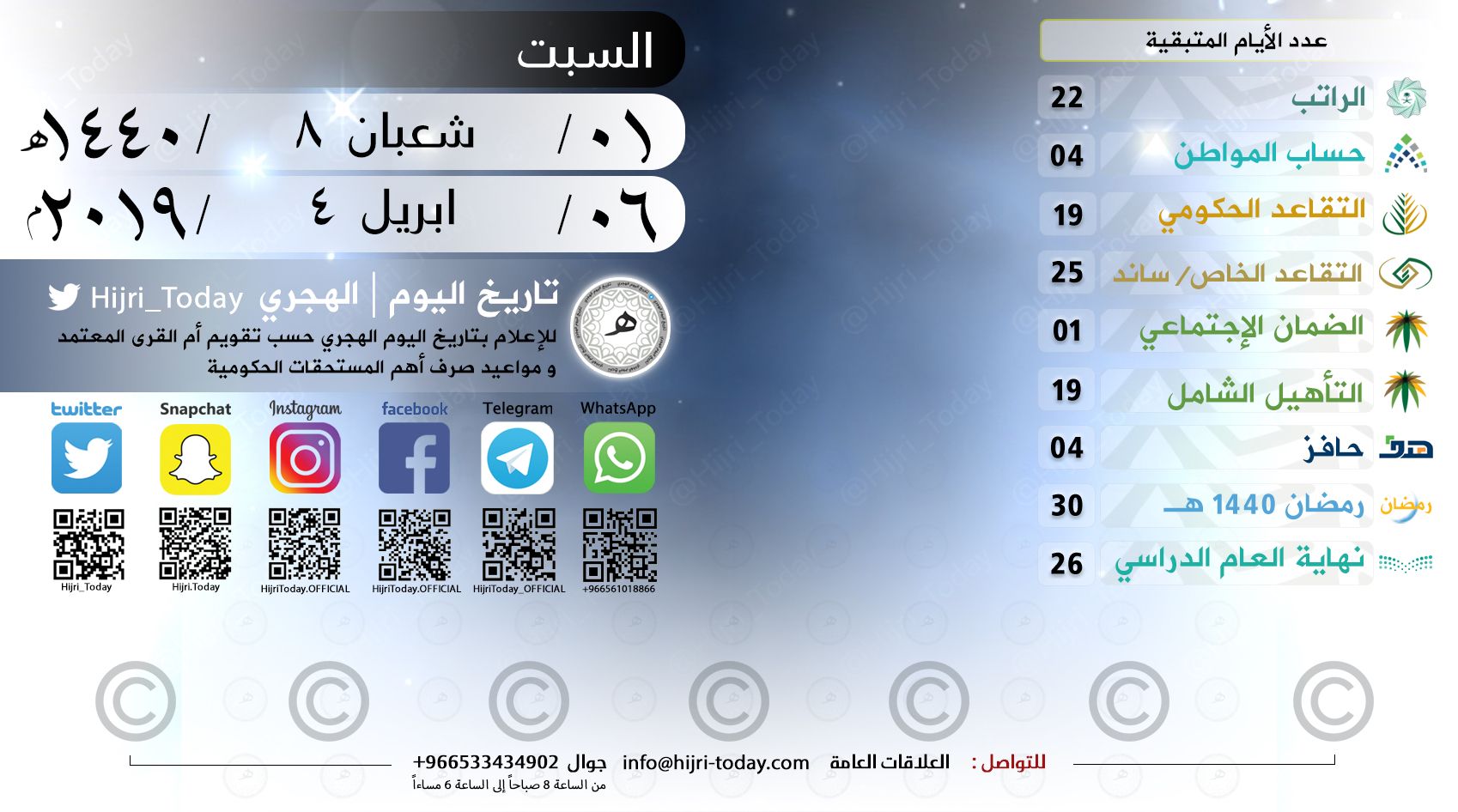 تاريخ اليوم الهجري On Twitter السبت ٠١ شعبان ٠٨ ١٤٤٠هـ الموافق ٠٦ ابريل ٠٤ ٢٠١٩م ايام متبقية الراتب 22 ح المواطن 04 تقاعد حكومي 19 تقاعد خاص ساند 25 الضمان 01 التأهيل 19 حافز 04 رمضان 30 نهاية الدراسة